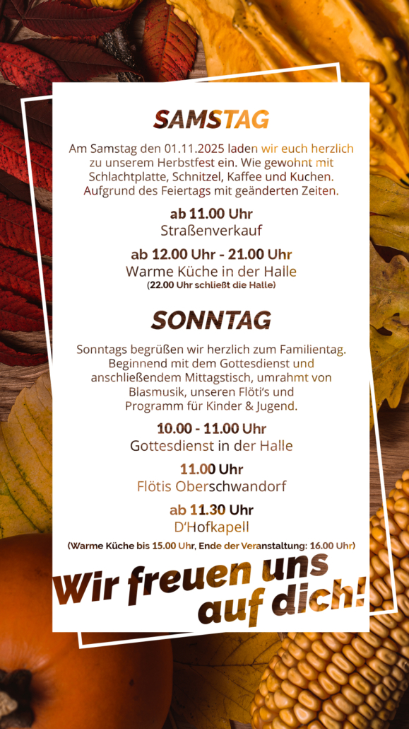 Am Samstag den 01.11.2025 laden wir euch herzlich zu unserem Herbstfest ein. Wie gewohnt mit Schlachtplatte, Schnitzel, Kaffee und Kuchen. Aufgrund des Feiertags mit geänderten Zeiten.